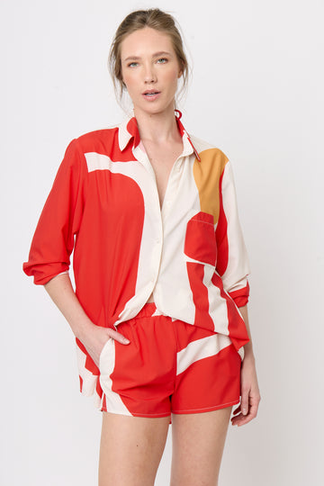 Short básico de resorte en cintura con bolsas, en sedeta con estampado de flor roja.