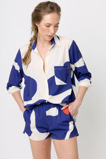 Camisa de manga larga en sedeta color hueso con estampado de flores azul marino.