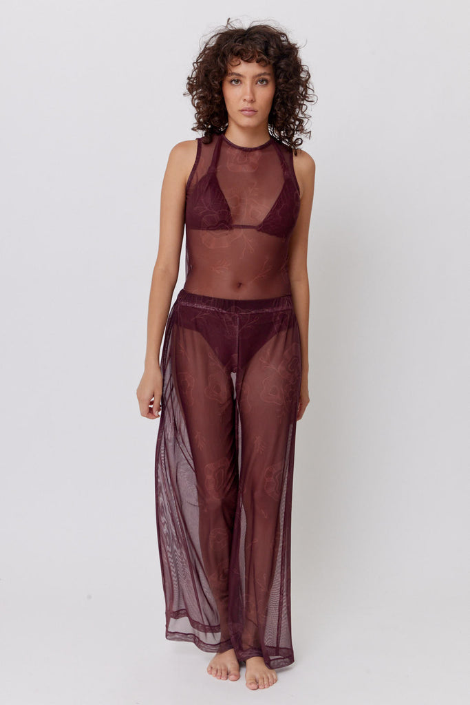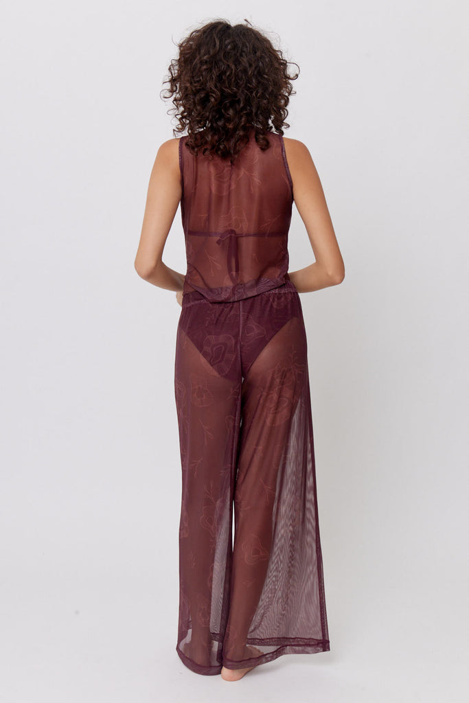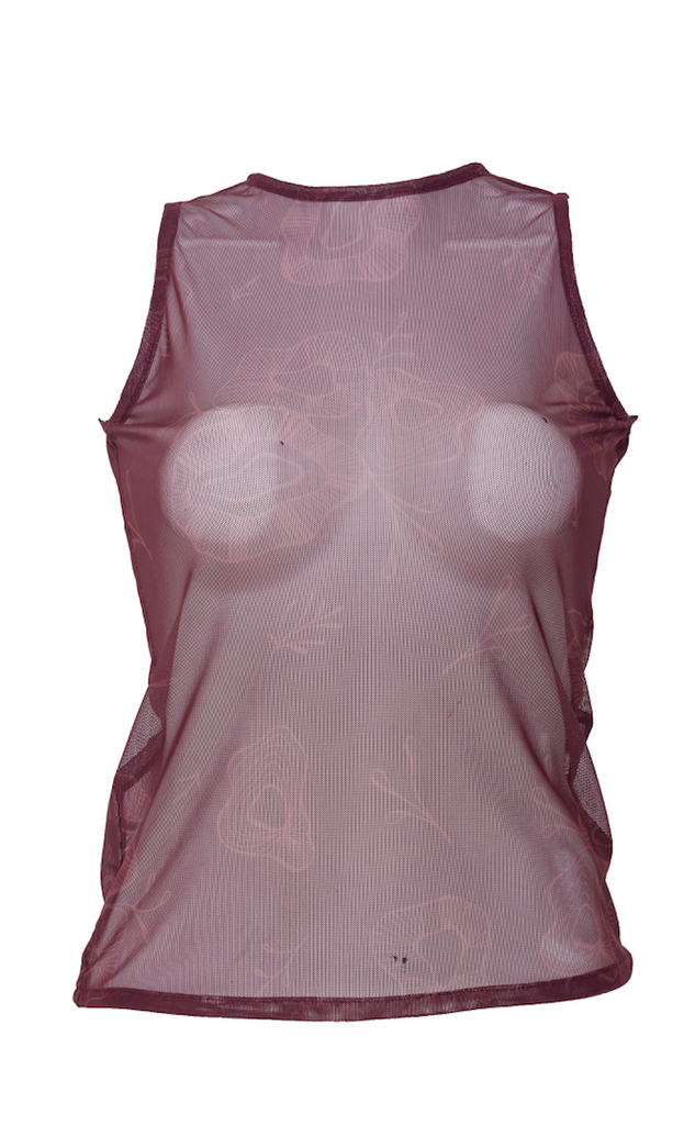 Camisa sin mangas de mesh estampada en vino flores fondo ladrillo