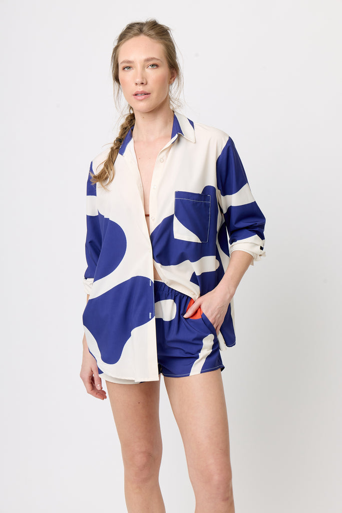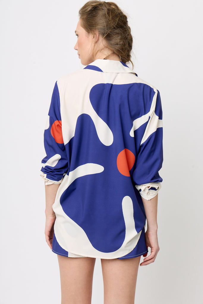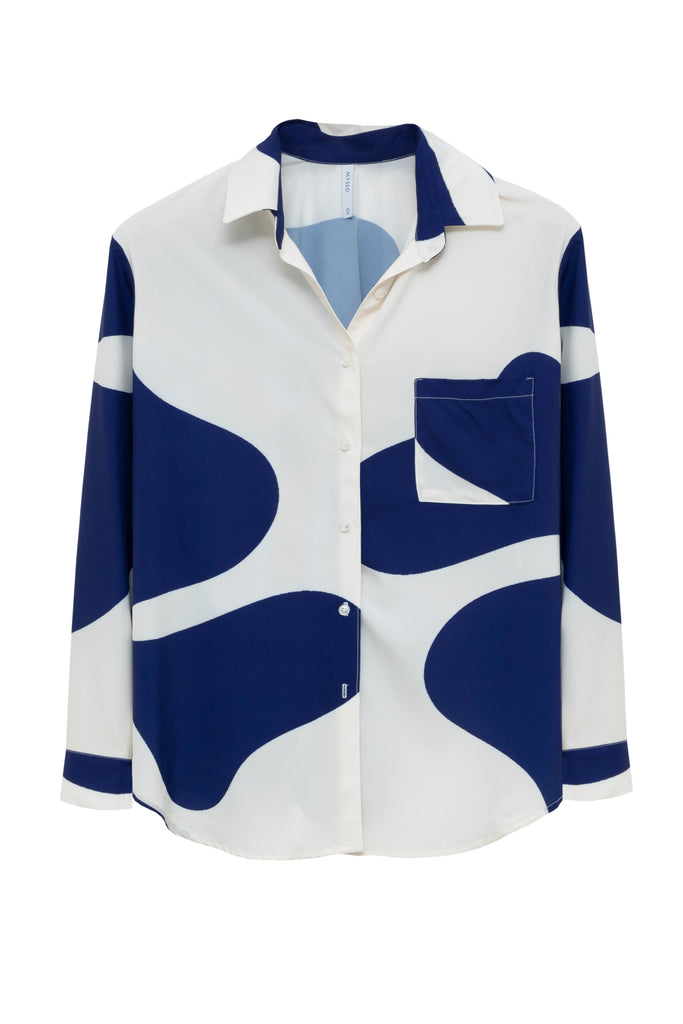 Camisa de manga larga en sedeta color hueso con estampado de flores azul marino.