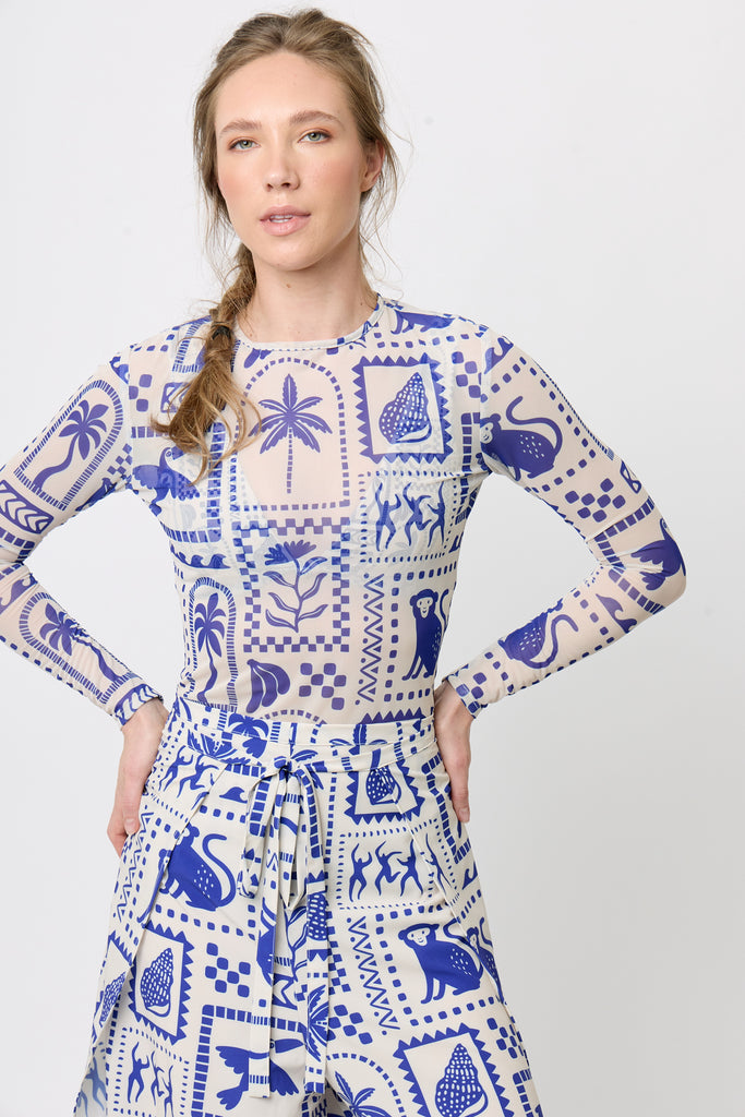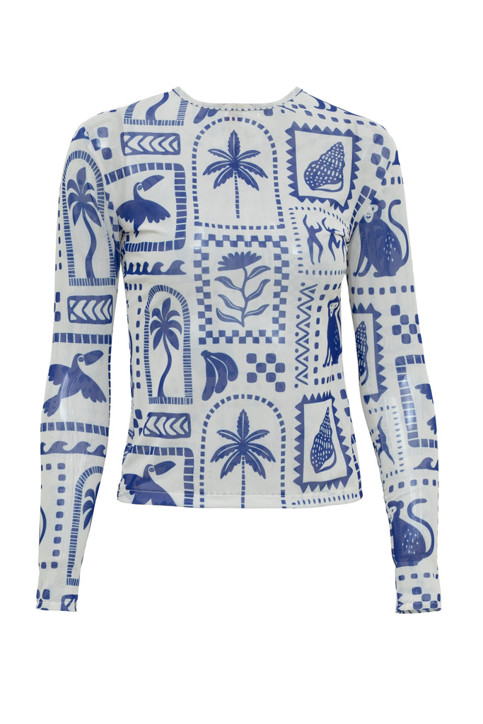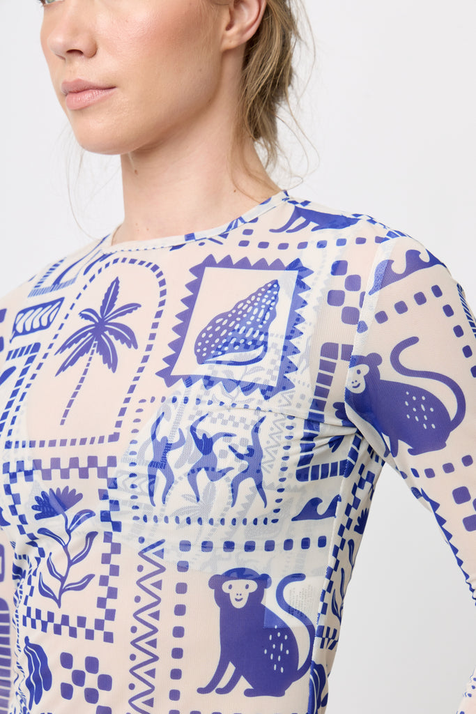 Camisa de mesh manga larga con estampado de changos, palmeras y tucanes.