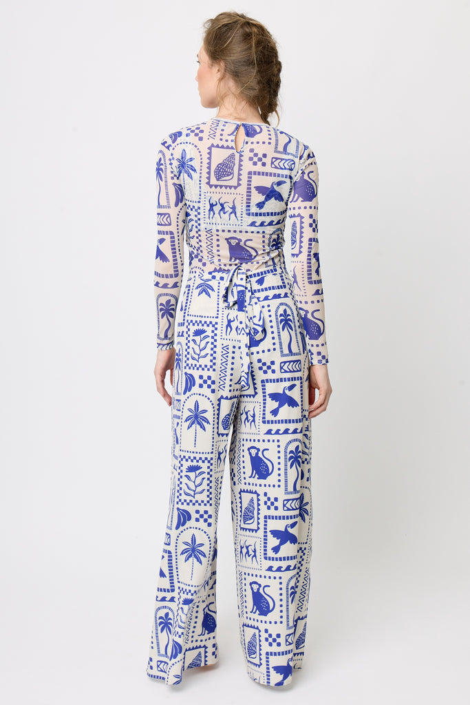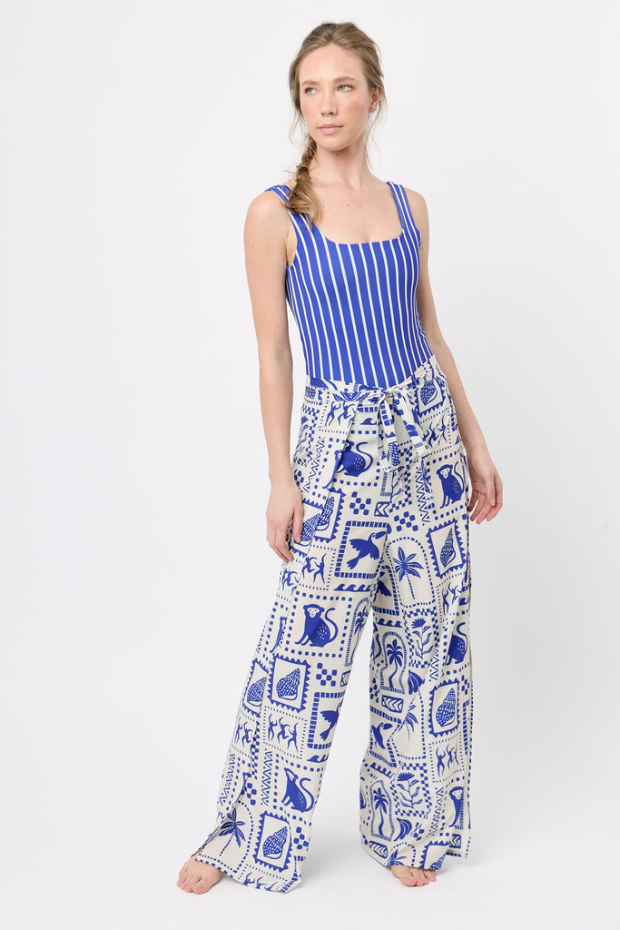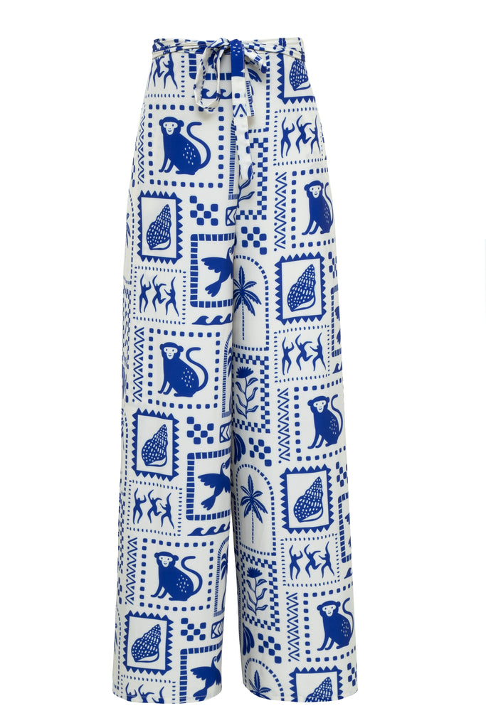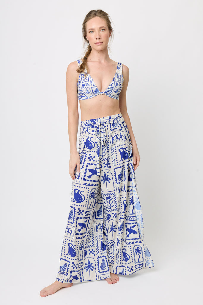 Pantalón/pareo amplio con amarre cruzado con estampado de changos, palmeras y tucanes.