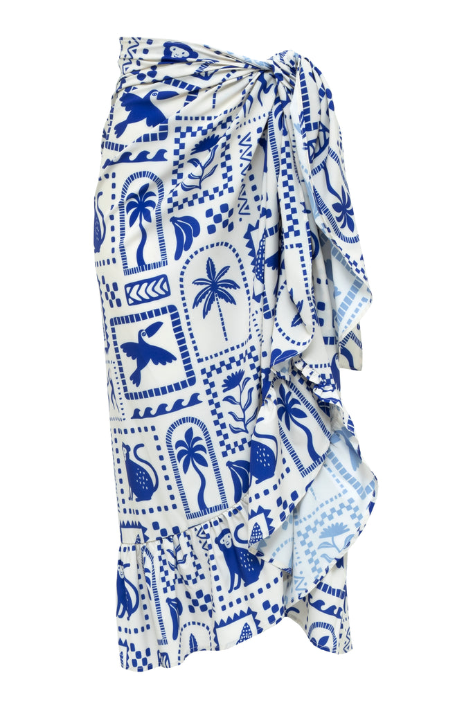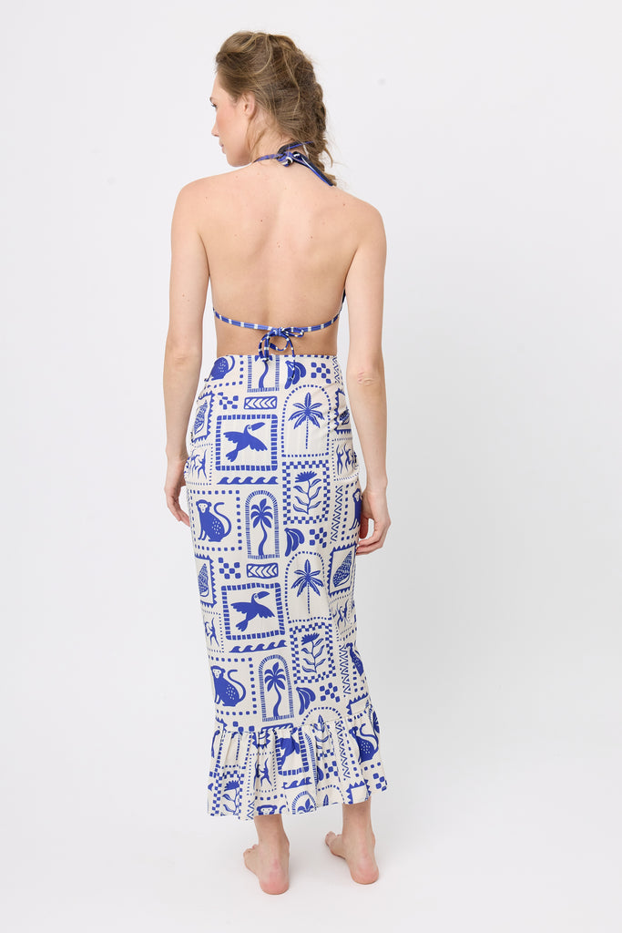 Pareo envolvente con olanes abajo con estampado de changos,palmeras y tucanes.