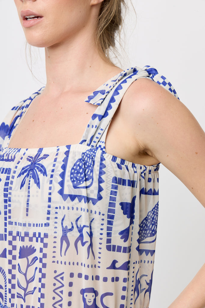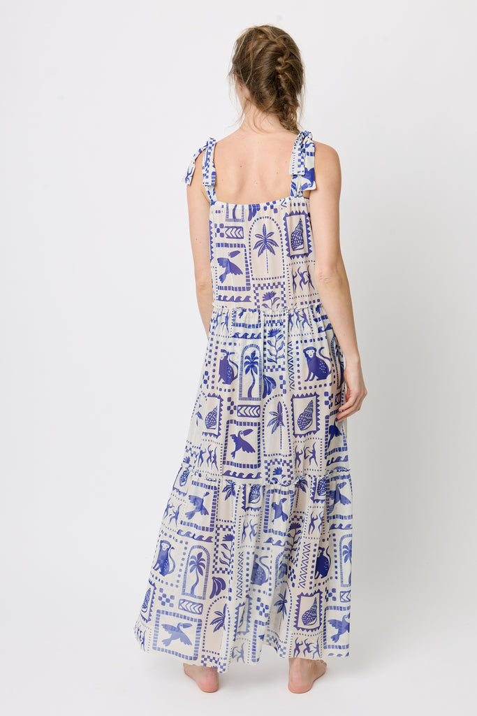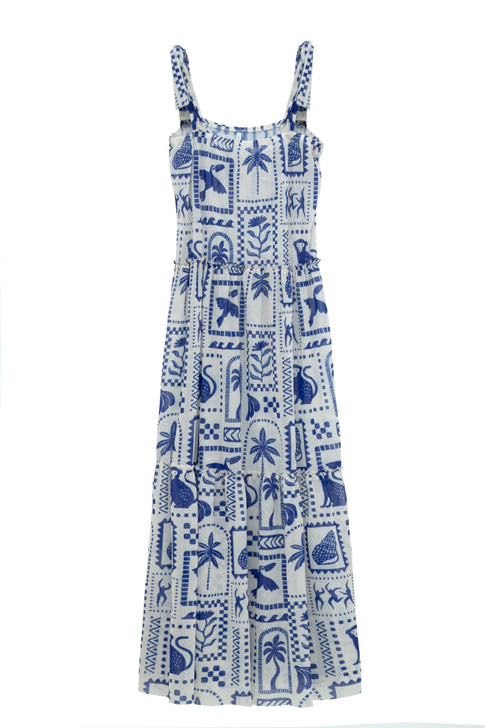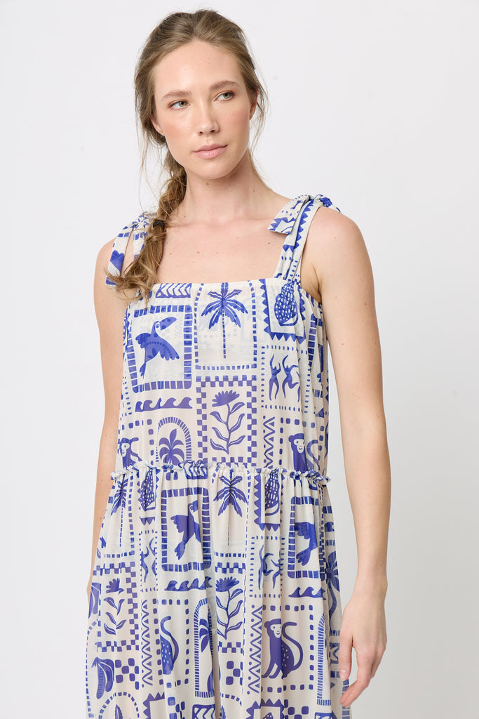 Vestido largo de mesh con amarre en los hombros con estampado de palmeras, changos y tucanes