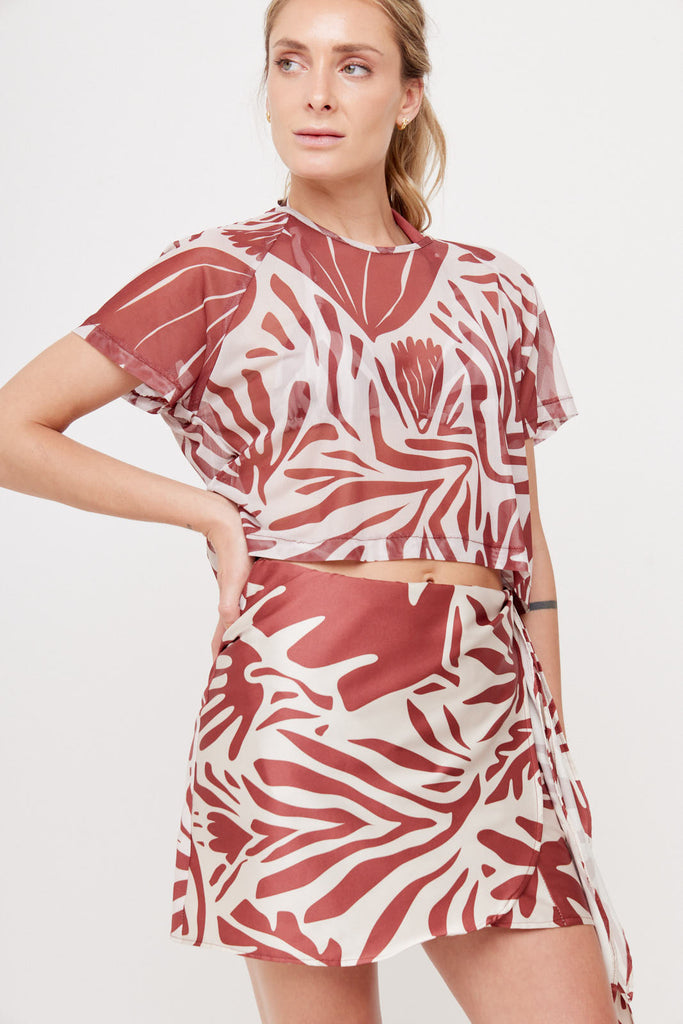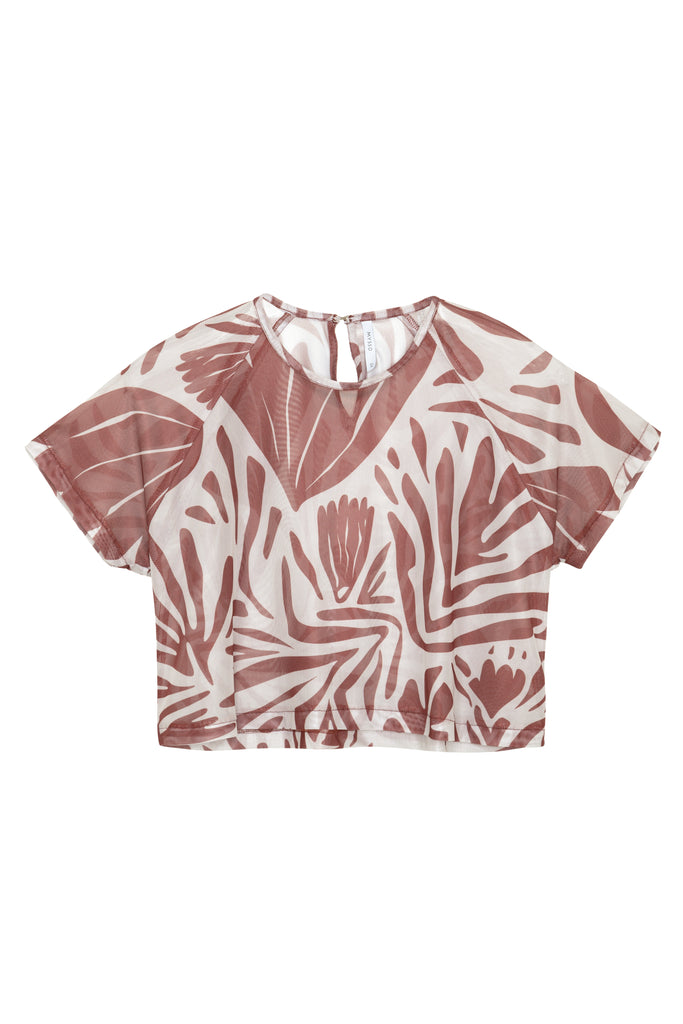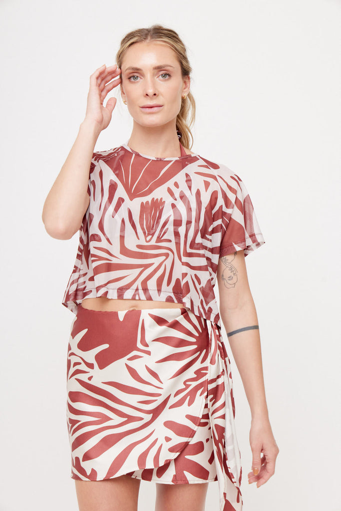 Camisa tipo crop top de manga corta en mesh estampado en plantas ocre