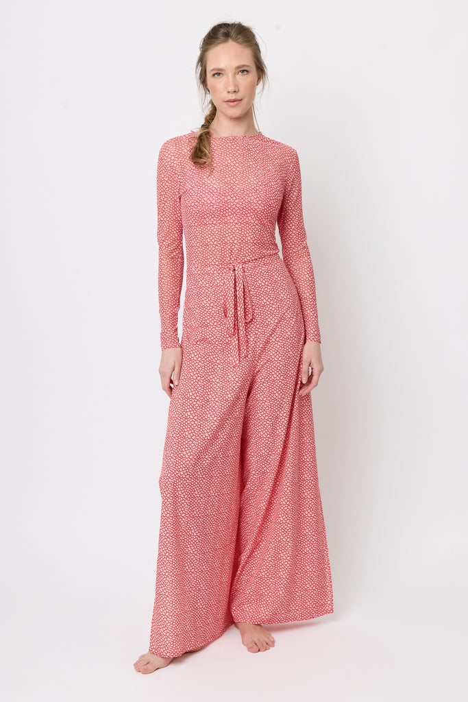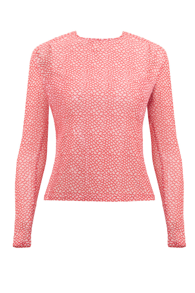 Camisa de mesh de manga larga con estampado de escamas rojo.