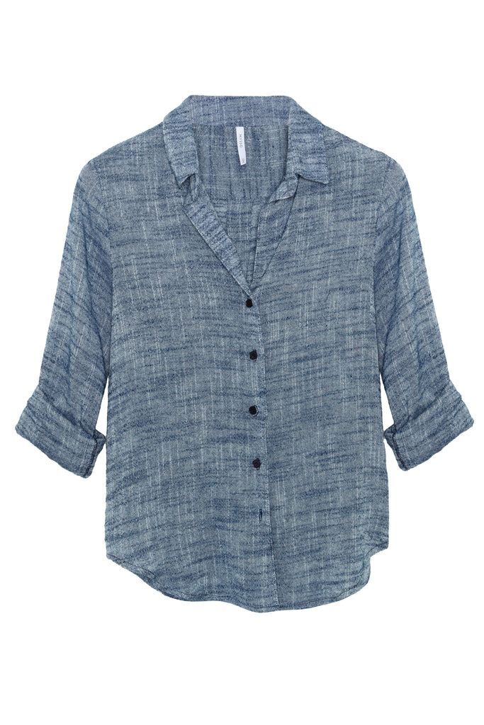 Camisa de manga larga con botones en color azul jaspeado con apariencia tipo mezclilla
